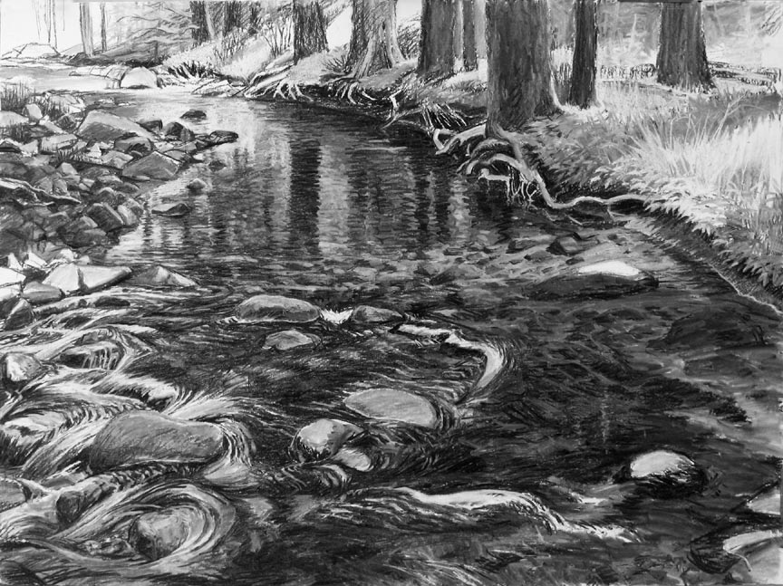This pleasant spot yielded several drawings. When this one was finished I was afraid I had tried to include too many water effects, and I did not think it pulled together. But I've become happier with it over time.