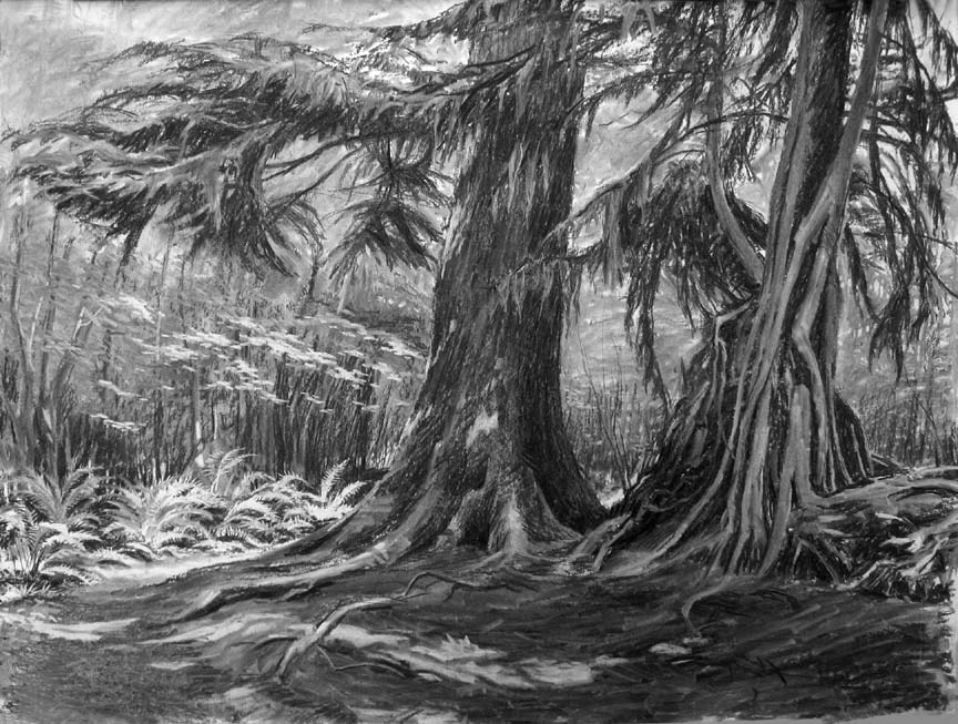 The Hoh Rain Forest is an awesome place, but difficult to draw. Vegetation rules here, and nothing, apparently, ever really dies. Trees fall or break off at their stumps and immediately sprout new trees from their own corpses. Most of what you see is too bizarre to draw. Trees like these are eight feet in diameter and over 250 feet high.